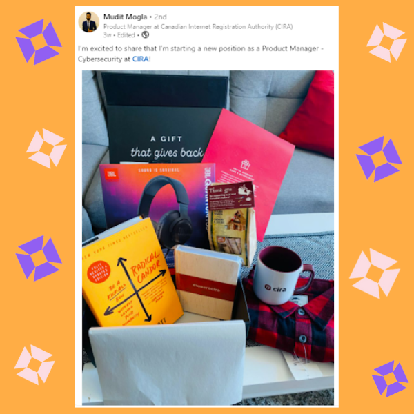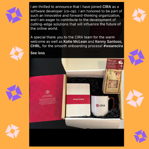 Since implementing their new process for employee onboarding gifts, CIRA has re-purchased new gifts multiple times. Their HR team is thrilled to have streamlined part of the employee onboarding process, and new team members are excited to receive a welcome gift that communicates their new company’s values right away. CIRA has been so pleased with these gifts that they've partnered with us to create gifts for other occasions such as holidays and sales kickoffs!